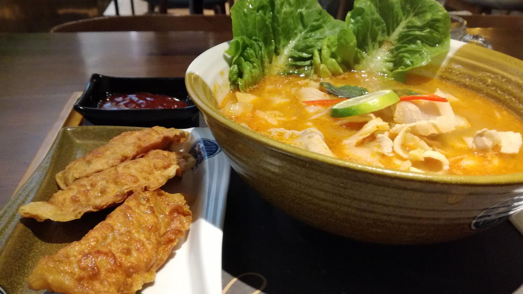 この日はトムヤムスープに豚バラのスライスをトッピング。サイドディッシュに揚げ餃子も。