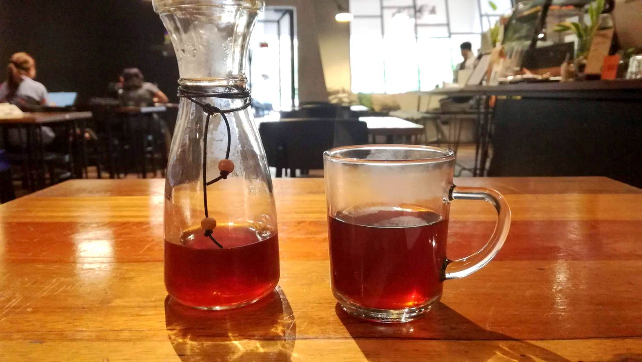 テーブルに座って5分ほど待っているとやってきたのがコレ。。。どこかで見た事のあるガラスのビーカー。この後別のお店でも同じような容器に入ったコーヒーが運ばれてきたので、この形態がマレーシアではウケてるらしい。