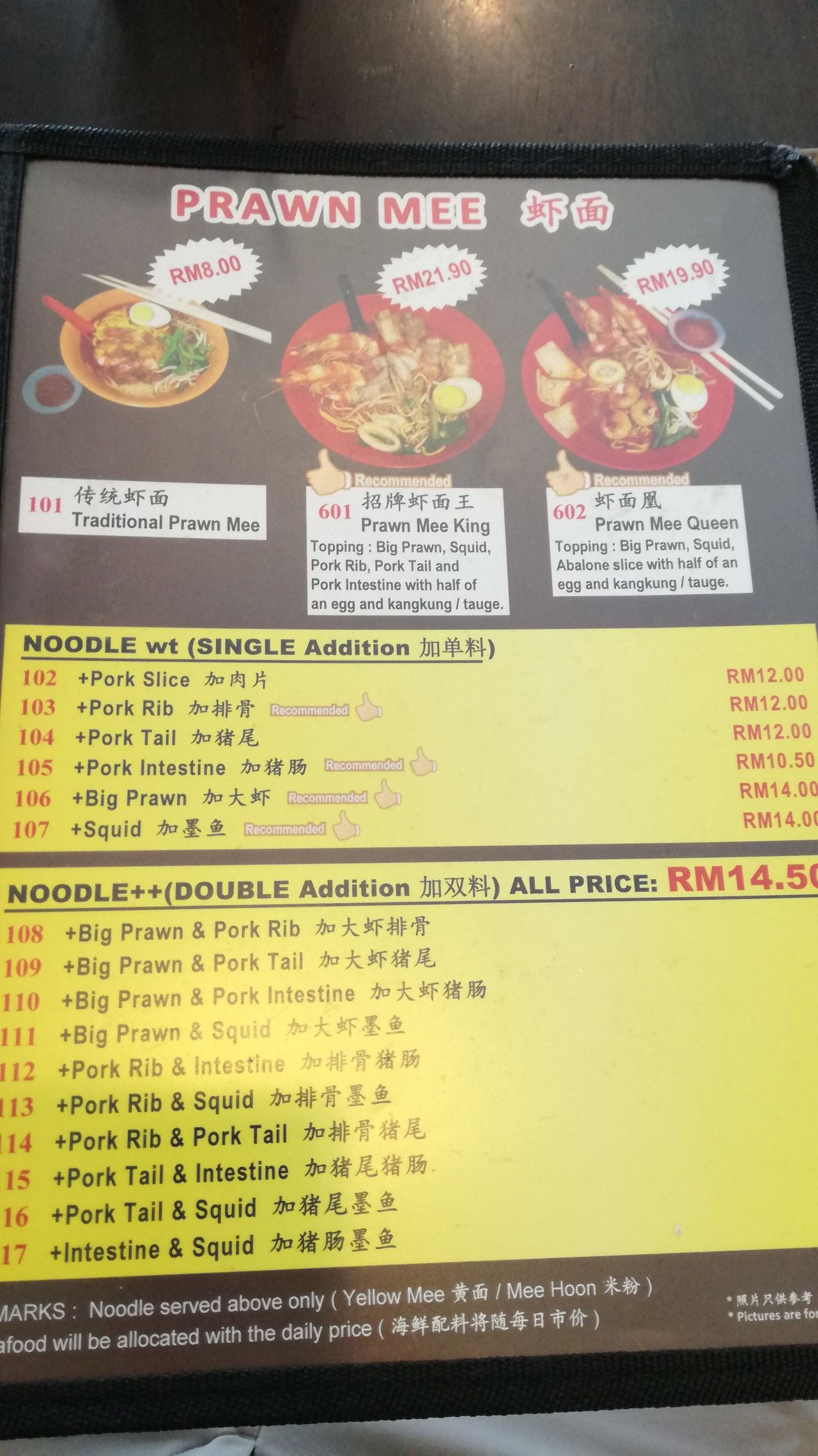 クイーンの具材は大きな海老x2、小さい海老も少し入っているうえに、イカ、そしてあまり味のしない鮑が3枚程。たぶんトコブシ。んー、これなら5リンギ安い海老&イカのでいいかな。