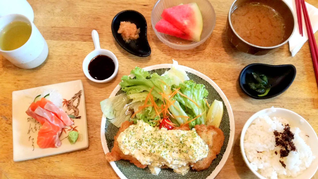セットのメニューはご飯、お味噌汁、メインの魚フライ&サラダ、刺身、お漬物、お浸し、スイカ、後から来た茶碗蒸し。
