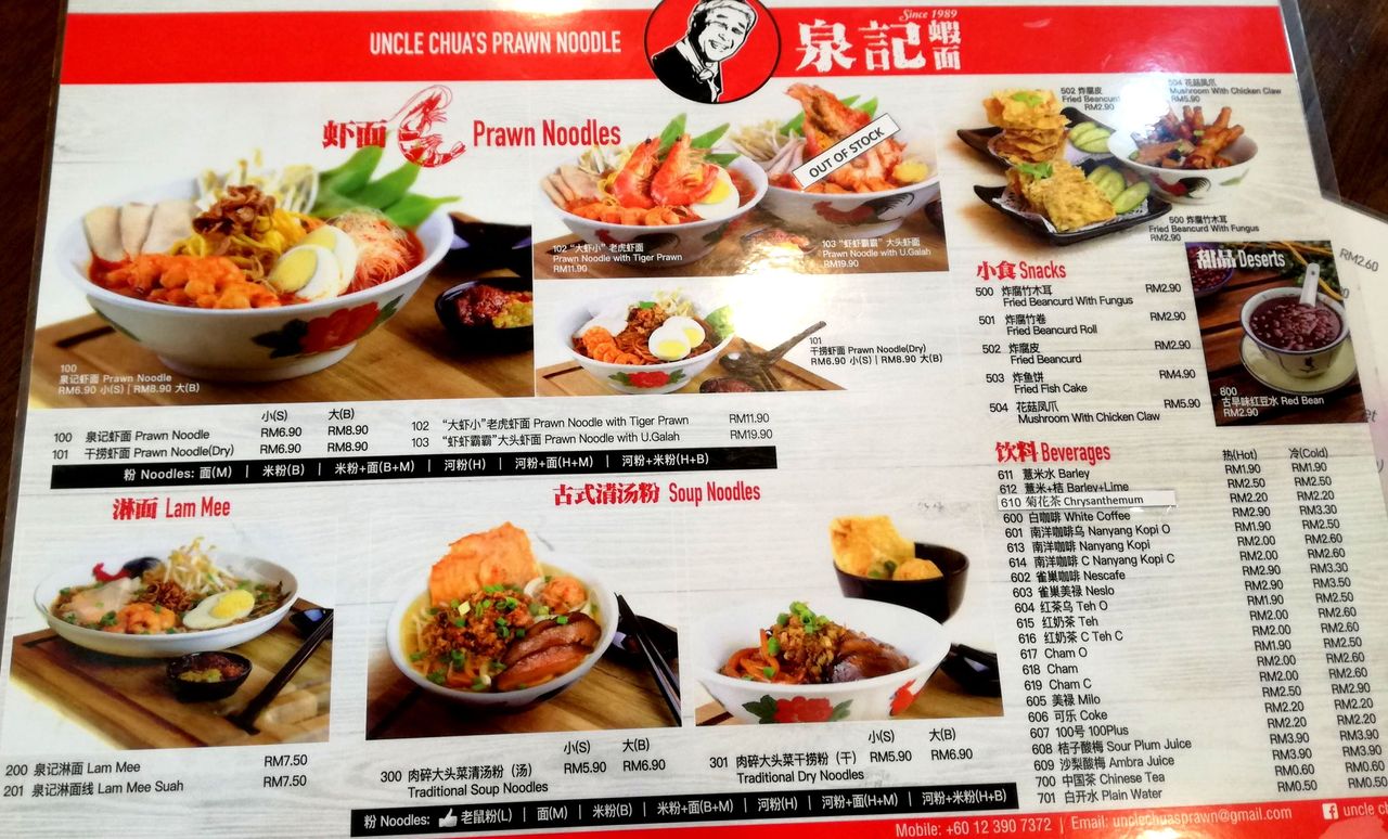 タイガープラウン入りなどちょっと豪華なメニューもあったけど、基本のPrawn Noodleの大、麺はMeeとビーフンのMixで注文。お茶と合わせて9.60リンギ。安い。