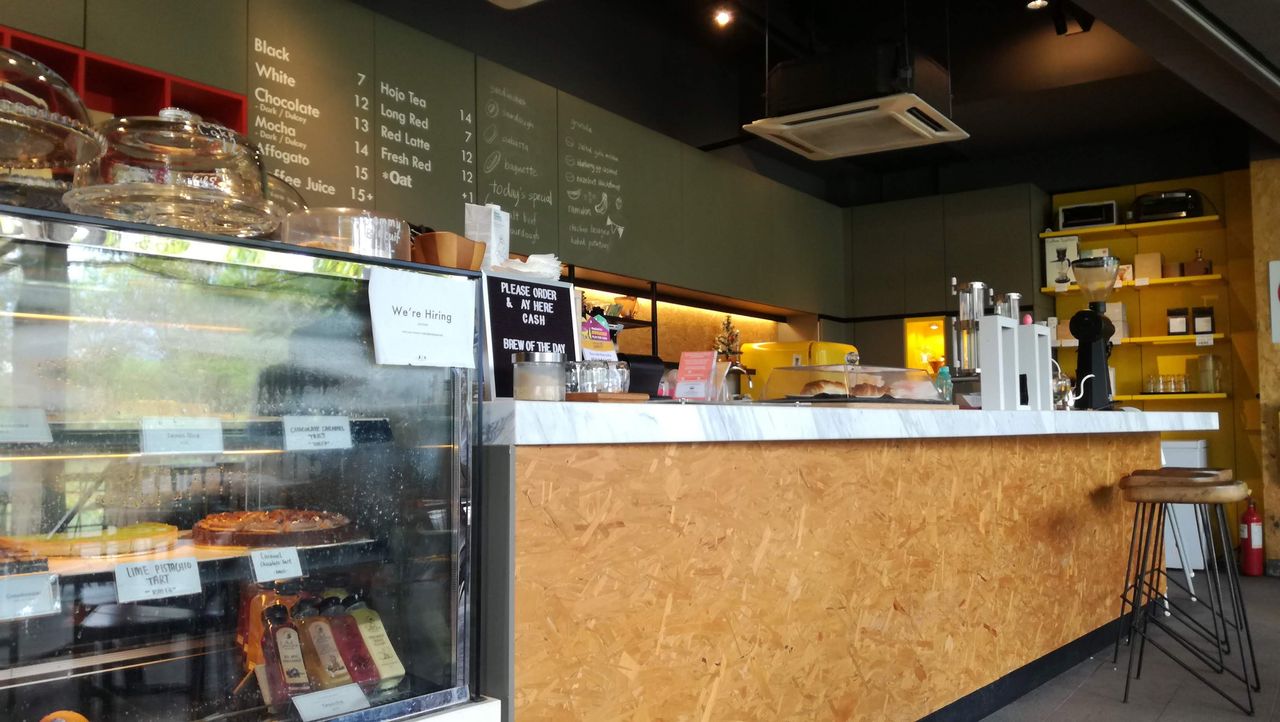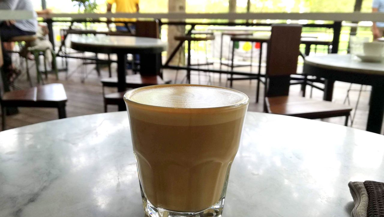 ランチはした後だったので地上階の角っこにあるこちらのお店で一休み。カフェラテのホットを注文。12リンギ。