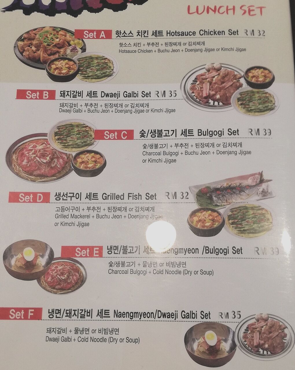 でも名前を知っていただけで行くのは初めて。メニューを見ると焼肉やビビンパ、チゲなど一般的な韓国料理は一通りあるし、かなりボリュームありそうなランチセットもあったのでその中からキムチチゲ、チヂミ、プルコギがついてくるセットCを注文。39リンギ。