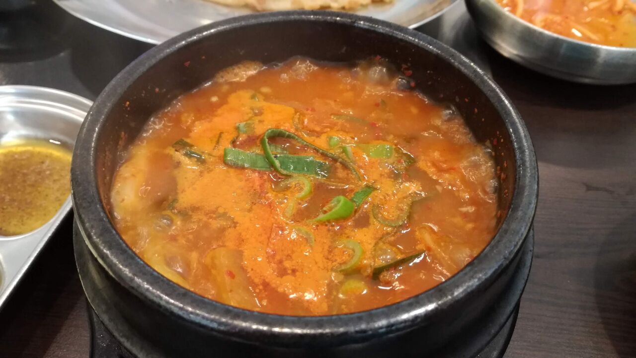 続いてチヂミ。ニラが入ったシンプルなチヂミ1枚を二人でシェア。まあこんなもの。そしてキムチチゲは辛さそこそこ、具沢山でなかなか美味しかった。上の写真はもちろん一枚ずつ食べた後。
