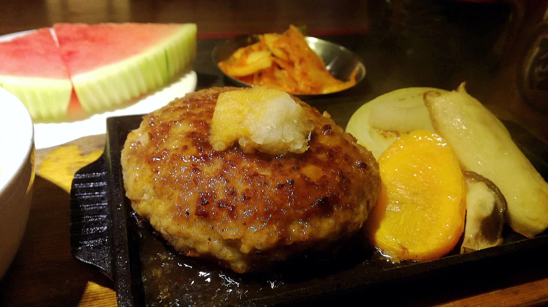 たっぷりと20分ほど待って鉄板の上でジュージューいわせるハンバーグがやってきた。目の前でお店のスタッフが和風ソースを鉄板の上のハンバーグにかけると更に鉄板がジュージューといってくる。焼き野菜と共にキムチ&スイカがついてくるのが焼肉屋さんっぽい。