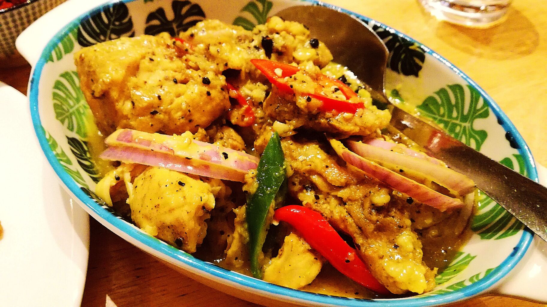 こちらは看板の通りカニが名物のお店で、QRコードでメニューをスマホに出してみてもカニが目立つけど一人だったのでカニはパスして他のメニューを注文。残念ながらランチセットはないみたい。お店の人に色々と聞いて、注文したのはGarlic Butter Chickenとライス、そしてKatta Sambolという、フライドオニオンと唐辛子のサンバルも注文。