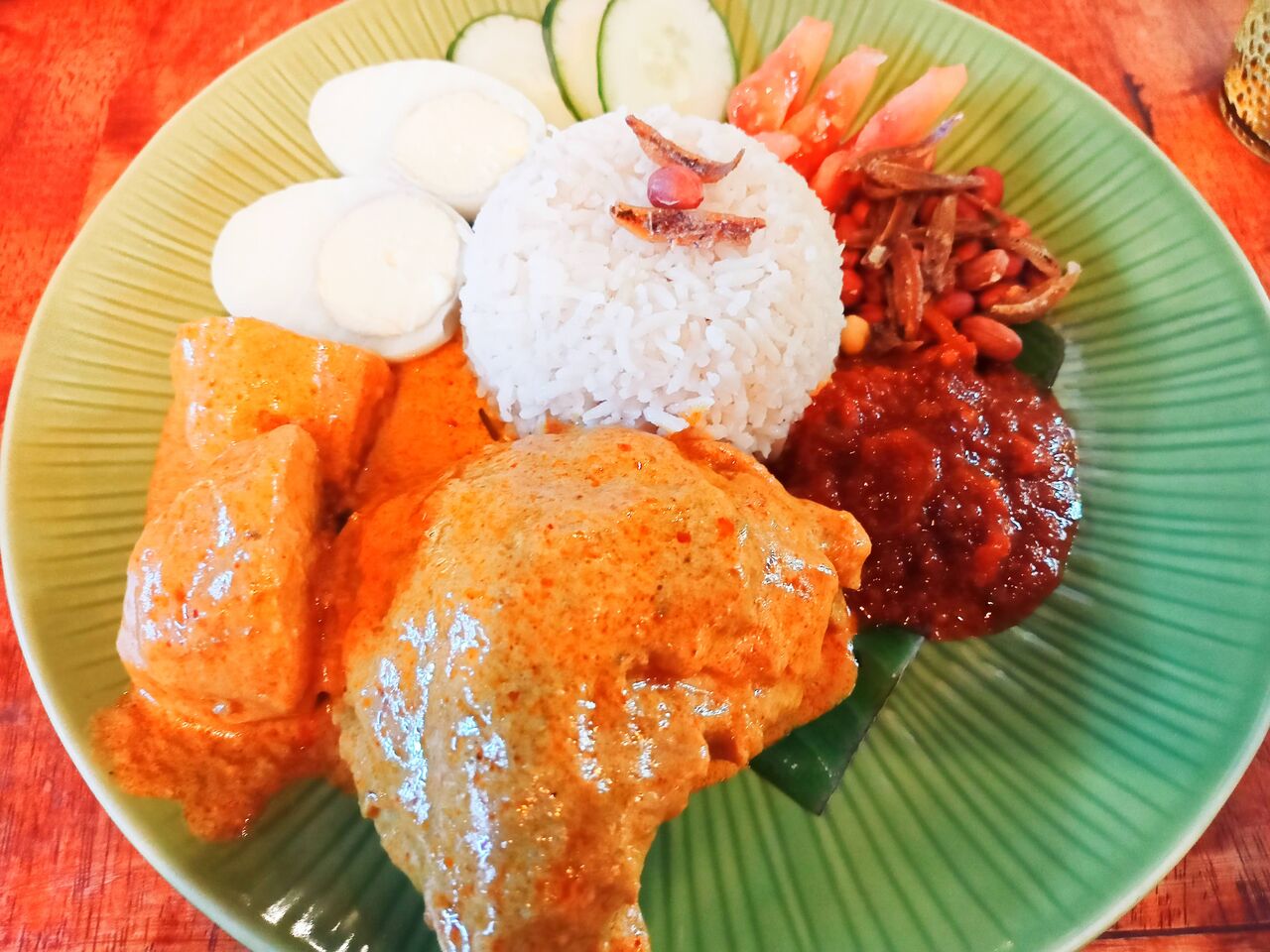 チキンは手羽と胸肉で柔らかくなるまで煮込まれていてジューシーで美味しかった。サンバルはちょっと甘め、ご飯や他の具材とも合っていて美味しいナシレマだった。